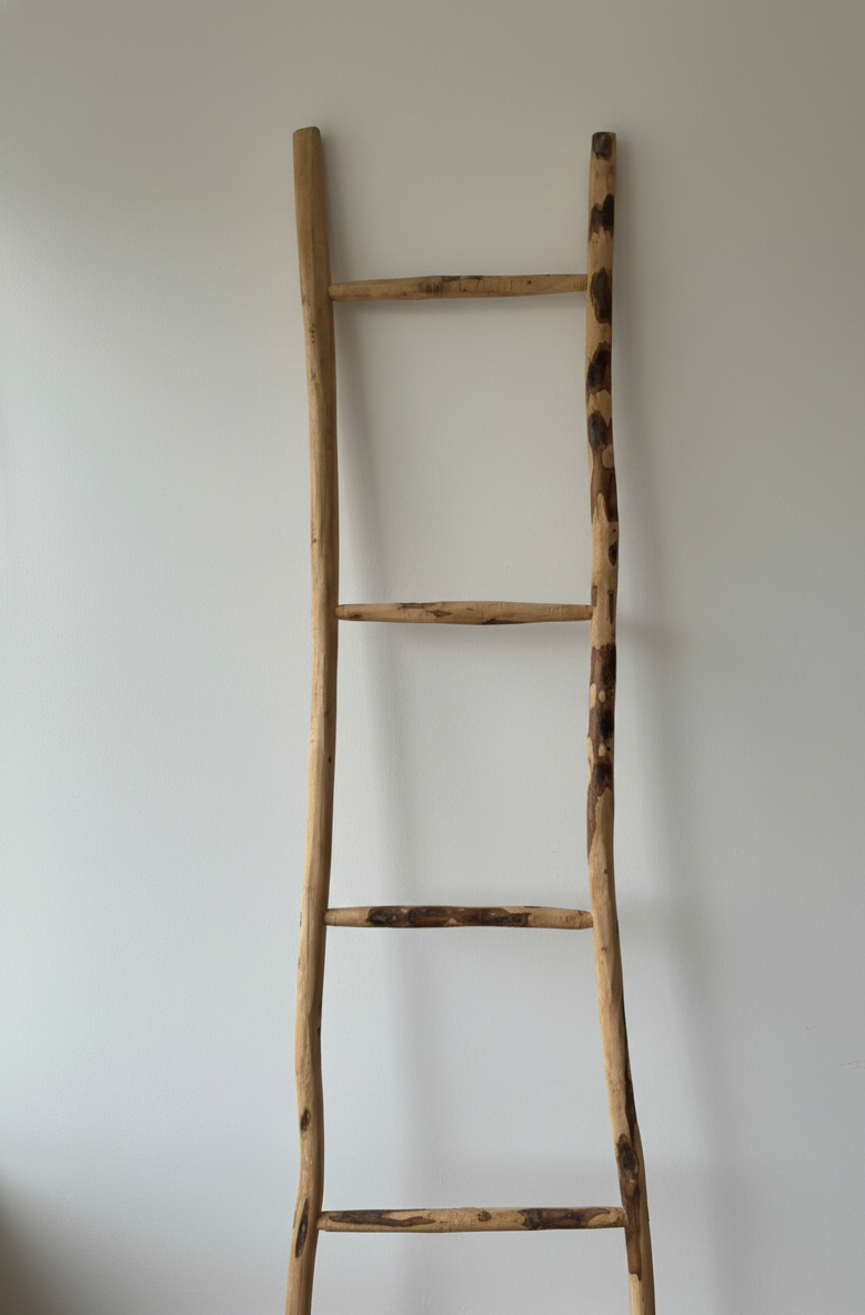 Chaque exemplaire de notre échelle décorative en bois est une pièce unique. D’abord, nous utilisons du bois véritable sélectionné pour ses irrégularités naturelles. Ce choix s’inscrit totalement dans la tendance “Slow Déco”. De plus, son allure brute et ses nœuds apparents séduisent les amateurs d’objets vrais. Par conséquent, cette échelle décorative en bois rompt avec la rigidité des meubles industriels classiques. Elle s’intègre parfaitement dans un style bohème, rustique ou scandinave.