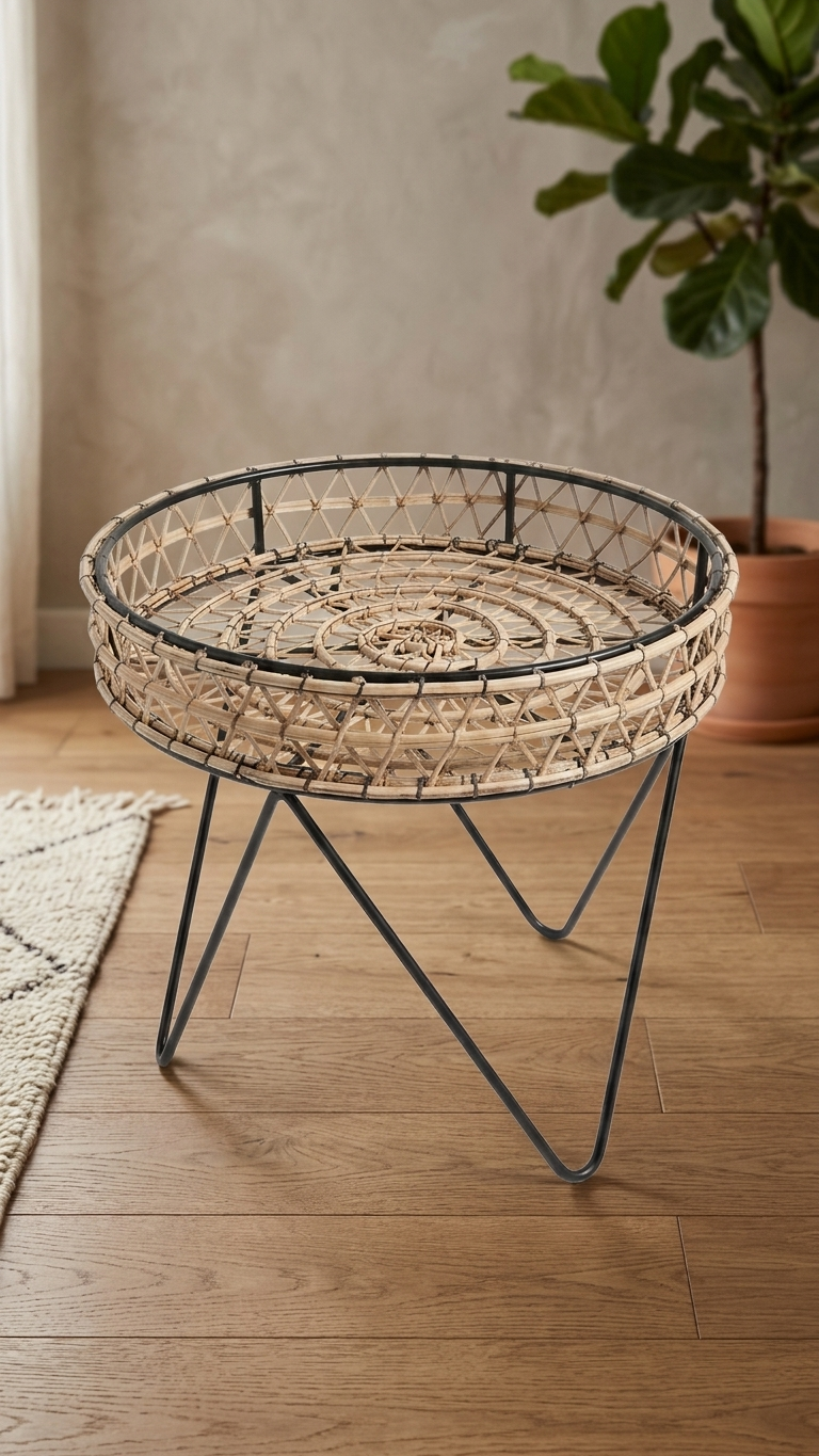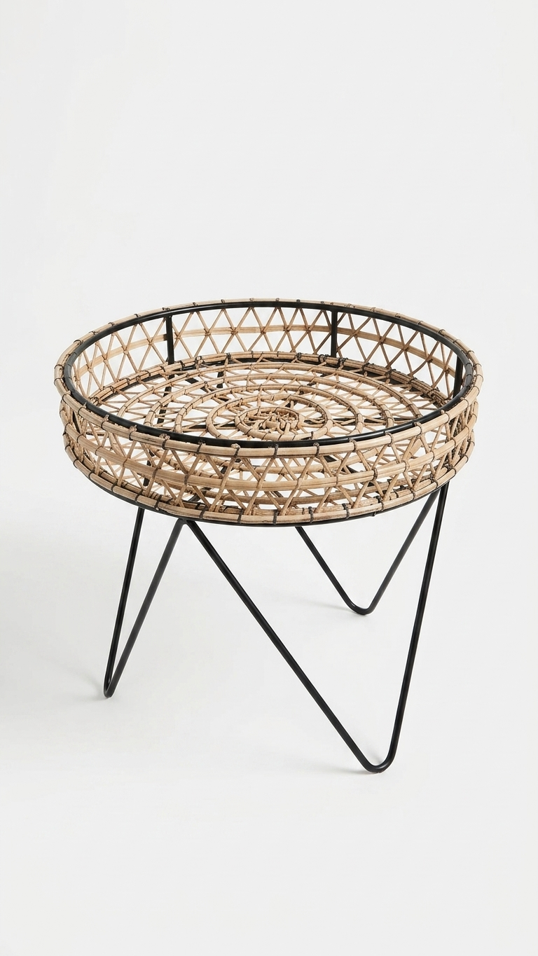 Apportez une touche de nature et de modernité à votre intérieur avec cette table d’appoint artisanale. Alliant la chaleur du rotin tressé à l’élégance d’un piétement en métal noir, elle se glisse parfaitement dans un salon, une chambre ou sur une terrasse couverte pour un look bohème irrésistible.