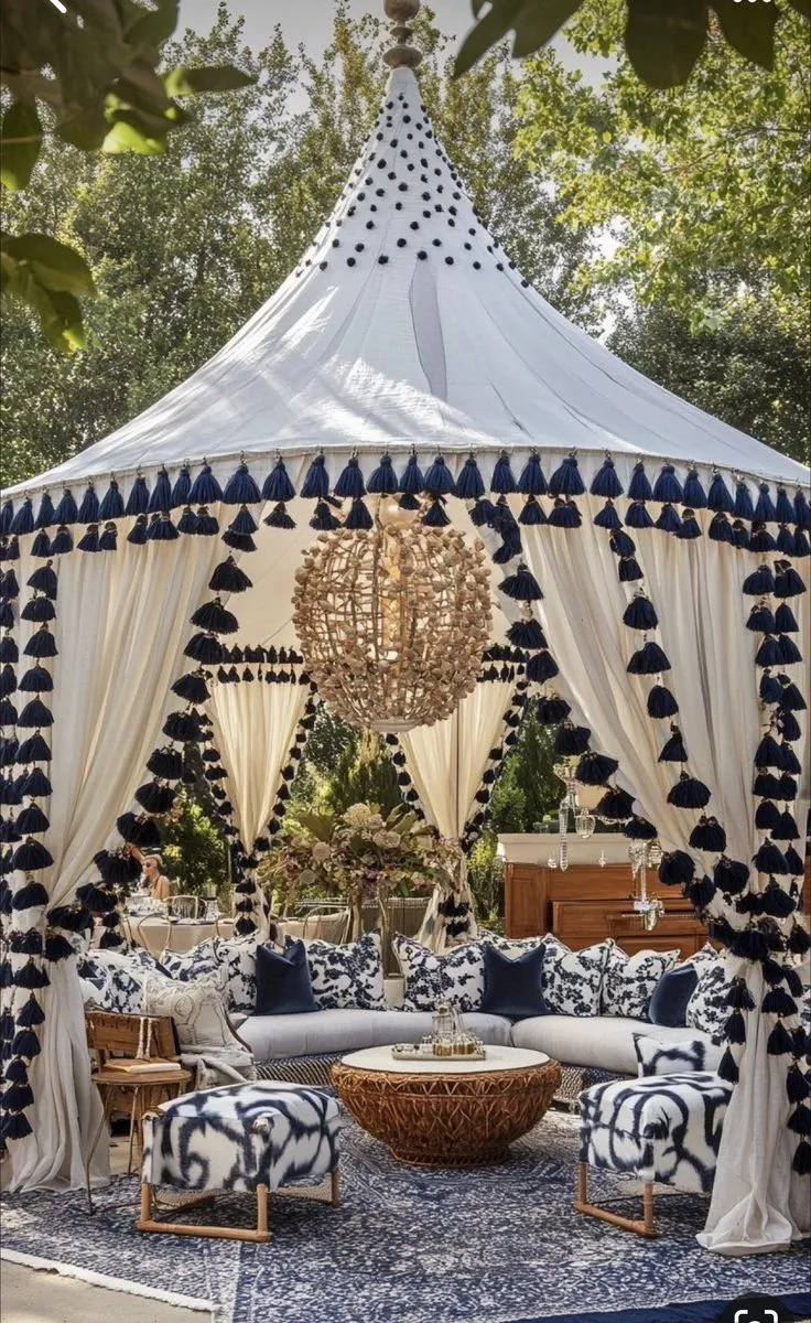 Sublimez vos événements extérieurs avec notre tente de jardin de luxe. Inspirée par le design marocain traditionnel, elle se distingue par sa structure en dôme pointu, ses finitions à pompons bleu marine et ses voilages aériens. Idéale pour un salon de jardin haut de gamme, un mariage chic ou un espace lounge exclusif, cette tente allie confort absolu et esthétique raffinée.